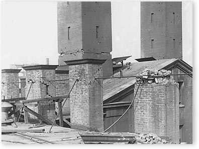 Superintendent Frank A. Leach arrived at the mint from Oakland early in the morning, and immediately charge of operations. Through his coolness and ability the men under him worked to the best advantage. He took his turn at the hose with the others, and did not ask his men to go where be would not go himself. It is remarkable how he has stood the strain of the fire and press of business since. About fifty of the mint employees succeeded in reaching the building before the soldiers barred the way to all comers. Then a detachment of artillerymen, commanded by lieutenant G. W. Armstrong of the Sixth Infantry, entered the building to serve more as a guard than as a band of firefighters. Later, Lieutenant Armstrong and a few of his men did take an active part. Within the yard of the mint is an artesian well which proved the only water available. The pump connections were badly broken by the earthquake, yet the engineer, Jack Brady, did a lightning job in repairing the pumping plant, making connections in short order that ordinarily would require a long time. He finished his splendid work just in time to supply the fire fighters [all Mint employees] with two streams of water.