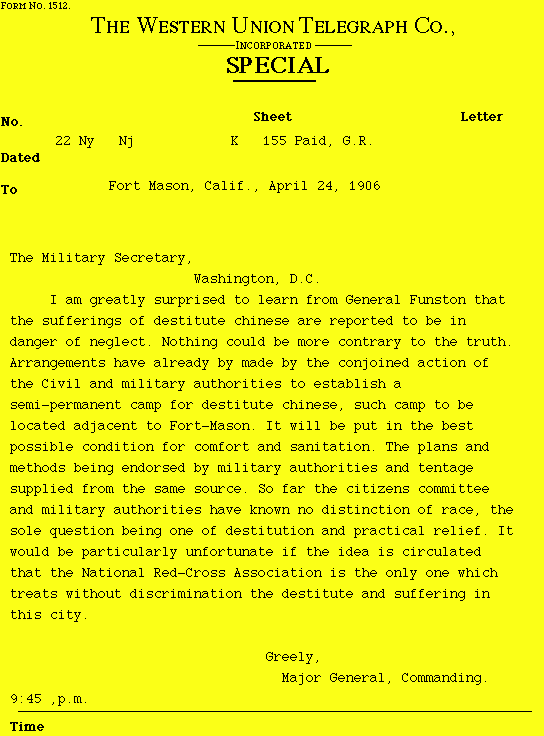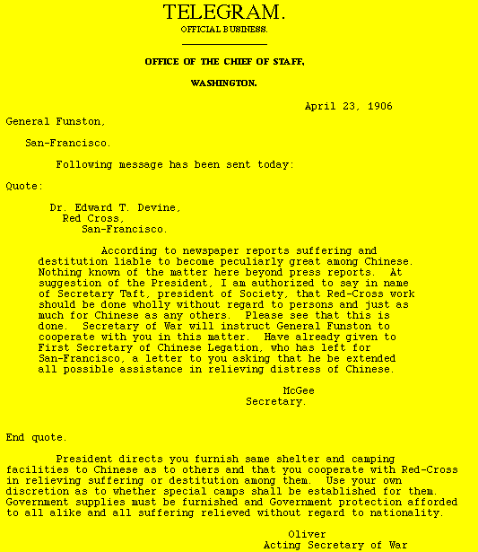 The U.S. Army and the San Francisco Red Cross and Relief Corporation had primary responsibility to support tens of thousands of homeless refugees. The issue of discrimination against Chinese immigrants was so important and critical that the White House intervened. This series of correspondence and telegrams outlines how seriously the discrimination issue was in U.S. foreign relations. Telegram from Gen. Greely Responding to War Dept. Orders Telegram to President Roosevelt from City Officials Editorial - Chinese Cared For Relocation of Chinatown China's Empress Dowager Contributes to San Francisco Relief Correspondence Between the State Dept. and the U.S. Legation in Peking Relief for the Japanese and Chinese Help from New York Chinese Association |