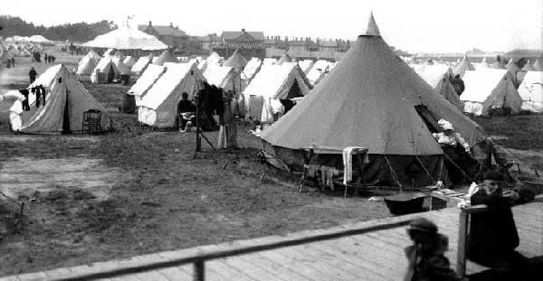 ![]() A large circus tent, rented by the army, stands in the field in front of the U.S. Army General Hospital at the Presidio of San Francisco. The tent was used to house medical supplies after a fire damaged the hospital's supply room. The former Letterman Army General Hospital occupies the site. |