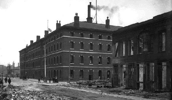 Appraisers' Building looking along Sansome from Jackson to Washington Street. This building was also known as the U.S. Custom House, and was saved by the U.S. Army from the Great Fire. Surviving buildings in the neighborhood were looted by the U.S.Army. |