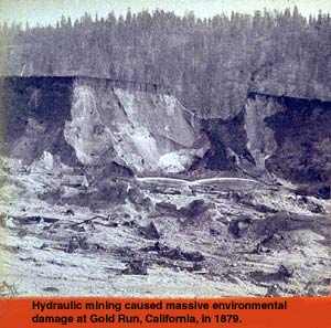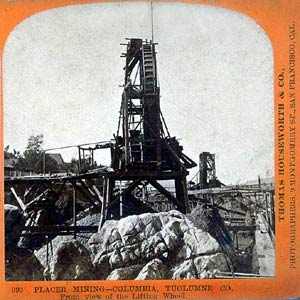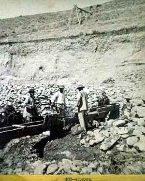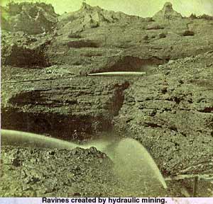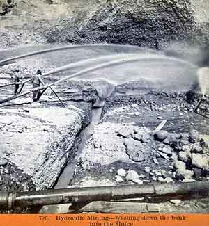 Another instrument which is used in but a few parts of California at the present day is the pudding-box. This is made of rough boards. It is about six feet square and a foot deep. Very tough clay that cannot be worked successfully otherwise, is thrown into this box together with water. A man stirs this mass until it is thoroughly dissolved. He then removes a plug, a few inches above the bottom, and allows the thin mixture of earth and water to escape. The heavier portion with the gold remains, more water is added, and the process repeated. When sufficiently separated in this manner, the pan or rocker is called into requisition to complete the work of parting the gold from the tenacious earth. The board-sluice was, for a time, an important auxiliary in gold mining. A trough of rough boards is constructed, not less than fifty feet long, and often several hundred or even thousand feet in length. The maximum width is one foot, and it varies from one foot to five feet in width. Riffles in the sluice serve to detain the gold which is also held by quick-silver. Through the sluice a stream of water constantly runs, the dirt is shoveled in, and as the soil dissolves and is carried away, the gold sinks to the bottom. Hydraulic mining is now extensively used. Early in 1852 the miners in the Sierra foot-hills were generally impressed with the fact that some other mode of obtaining the precious metal must speedily be adopted. Many had made money by picking the gold from crevices with knives and spoons, but this could no longer be done. The earth near the water-courses had been mined over with pan or rocker. The sluice had been employed for ground more remote from water, but that means of mining had ceased to make a rich return. Many had discovered by shafts and tunnels that very valuable deposits were to be found in strata deeper than those which they could readily reach. In the spring of 1852, a miner, whose name is not remembered, put up a novel machine on his mining claim at Yankee Jim, in Placer County. This machine was very simple. From a small ditch on the hill-side a flume was built towards the ravine, where the mine was opened; the flume gained height above the ground as the ravine was approached, until finally a head or vertical height of forty feet was reached. At this point the water was discharged into a barrel, from the bottom of which depended a hose, about six inches in diameter, made of common cow-hide, and ending in a tin tube, about four feet long, the latter tapering down to a final opening or nozzle of one inch. [Charles Waldeyer, of Cherokee, Butte County, California, in United States Mining Industry. Raymond, N.Y., 1874, p. 390.] Thus, like all great things, did hydraulic mining have its small beginning. The hose made of raw leather soon rotted, not only becoming very offensive, but also utterly useless. Some sailors adopted canvas, and that has since continued to be used in many places, for conducting the water; in other localities iron pipe has superseded sail cloth.
